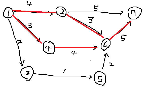입력 예제를 그래프로 표현했을 때 아래와 같이 나오며, 빨간색으로 된 간선이 정답이 되는 간선의 수와 값이다.