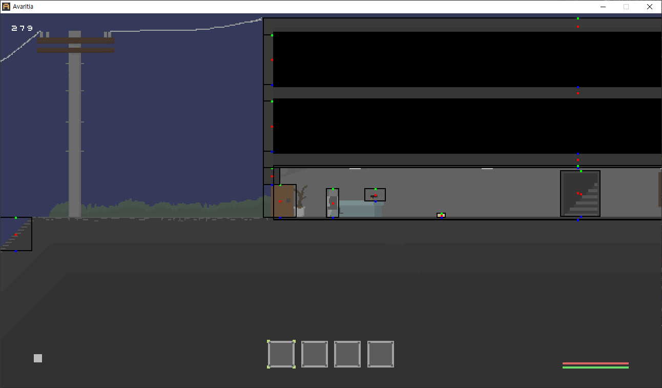 두번째 방법으로는 흔히 사용하는 각 오브젝트들이 사각형의 충돌판정 정보를 가지고, 이 정보를 통해서 충돌을 계산하는 방식입니다. 복잡한 충돌 공식을 필요로 하지 않았기 때문에 회전하지 않은 두 사각형의 충돌을 판별하는 AABB 알고리즘으로 충돌에 대한 판정을 계산했습니다. 아래 이미지에서 초록, 빨강, 파란 점이 같이 있는 검은 박스가 충돌 판정 범위입니다.